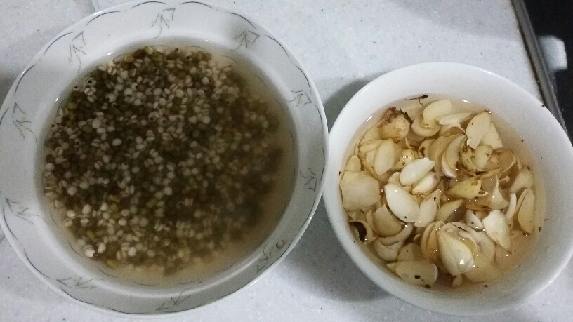 soak the mung beans, Job’s tears and lillybulb overnight or at least until they have absorbed most of the water.