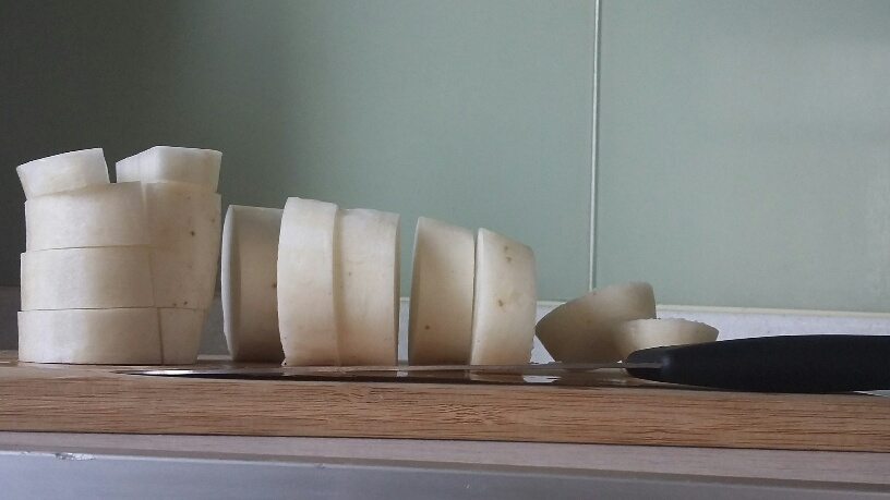 First gather the ingredients. Then wash and chop the radish, making sure there is no visible dirt, blemishes or root bits. You could also peel it, but I find that annoying and unnecessary. Plus, a lot of the nutrients are in the skin.