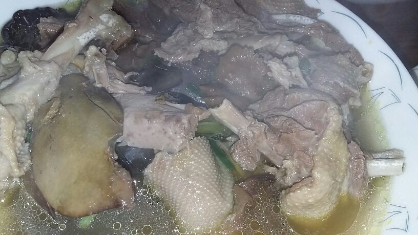 Good news is it’s also very simple to make. First, soak the duck in water and wash out all the blood and nasty bits (not the organs). Then parboil for 5-10 minutes. Discard the water and put the duck in a pressure cooker with some water, ginger and cooking wine. Once it’s pretty much cooked, add in extra stuff and salt, continue cooking and……… It’s done!!!!! As “extra stuff” I suggest foods with a lighter taste like fresh mushrooms, leafy greens, vermicelli or even chestnuts(they’re in season). We used wood ear mushroom and fresh duck blood- sooooo goood!!!!!