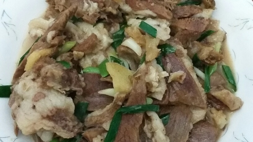 Boil the mutton until fully cooked, discard the water and chop the meat into cubes or thick slices. Heat a wok on medium high heat, a a little bit of oil (no more than 1-2 tbsp) and stir fry the lam for 30 seconds or so. Add some soy sauce, the ginger and cooking wine and continue stirfrying for another 2 minutes or so. Add 1-1.5 liters of hot water. When the mixture is boiling, turn the heat to low, cover and allow to simmer. After about 10 minutes, add the welsh oinon and continue cooking until there is little liquid left (around 15min). Remove from heat, serve and enjoy!!!!!!