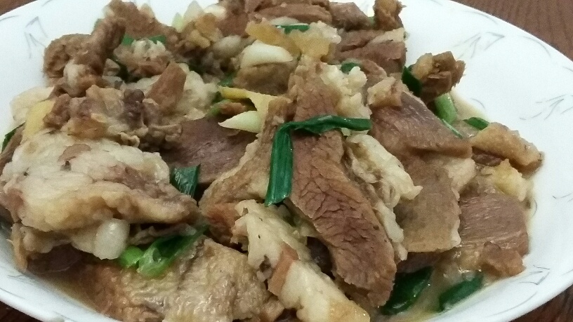 This is one of my new favorite dishes. We use preboiled lamb from my mom’s hometown. Preboiling the lamb cleans it up, renders fat, and drastically shortens cooking time. Basically, we stir fry it with minimal oil, add hot water, seasoning, cooking wine, and let it simmer. When it’s halfway done, we throw in a few welsh onions for flavor and nutrients. It’s SOOOOOO good and healthy.