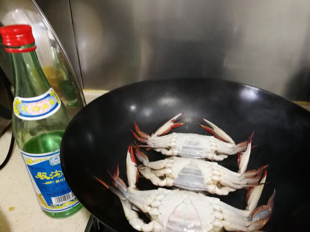 Heat a wok or large pan on medium high heat and place the crabs shell side down. After about 8-10 minutes, add 2-3 tablespoons of rice or cooking wine and wait 2-3 more minutes. Viola! Done! To get the most out of these crabs, serve with some ginger and soy sauce.