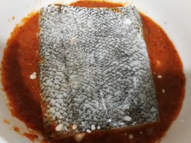 2. Puree until smooth, chill. Marinate fish for 12-24hours. For crispy skin, keep marinade off skin and rub with baking soda