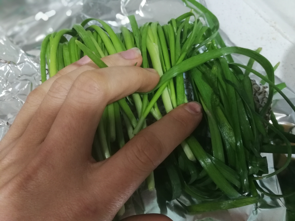 5. Remove filets from marinade and wipe off excess moisture and baking soda. Wrap in chives and foil. Bake for 8-12min (depends on thickness of filet). Remove from oven and unwrap