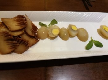 Quail eggs with Braised Cuttlefish- I probably should have gotten something like San Huang Chicken or smoked carp, but after seeing a picture, the choice was clear. Why? This dish featured cooked quail eggs that had translucent whites! Now that’s technique/ innovation. Taste wise, the dish was good, but not spectacular. The Cuttlefish was ridiculously tender and well flavored, but pretty ordinary. The eggs, although really cool, literally tasted like hard boiled eggs, unseasoned.