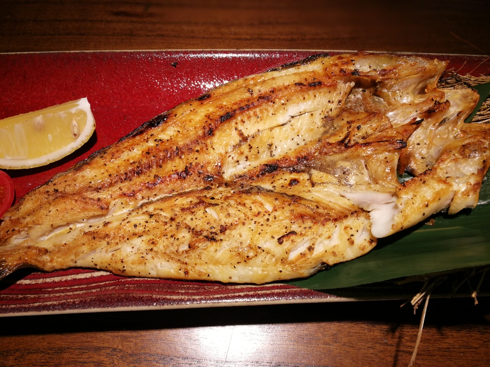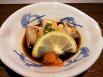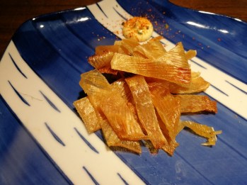 Grilled Fish Fin- This dish seems (and looks) strange, but it’s the perfect appetizer or snack. The pieces, cut into bitesized strips, have the texture of jerky, but the natural sweet umami of shellfish. I highly recommend this dish. Note: although it is technically an appetizer, the dish is at the back of the menu with the grilled items.