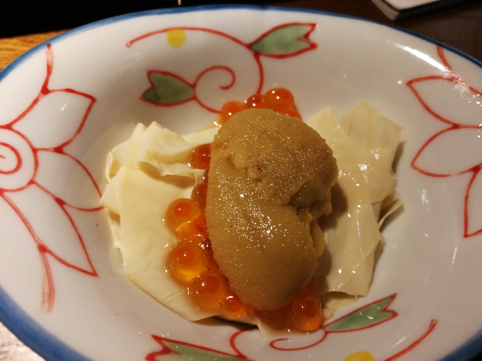 Uni with Salmon roe and Tofu skin- For some reason, I was really craving the sweet creaminess of uni (sea urchin). I was really excited when I saw this dish- sea urchin, salmon roe and tofu skin, for only 38RMB! Unfortunately, this dish disappointed. The uni wasn’t fresh (uni should be bright orange). In face, it wasn’t even properly defrosted. Honestly, if you want uni, splurge on the sashimi or the 198RMB version by the same name