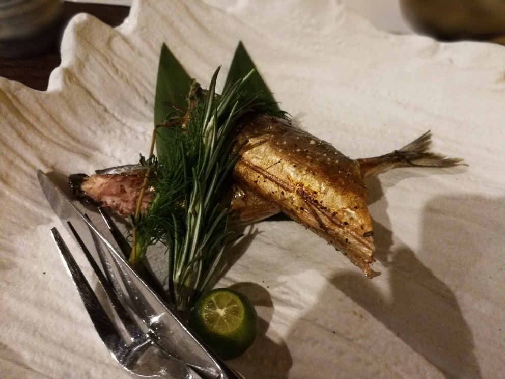 The items are skewered and slowly cooked in front of a mass of hot coals. This cooks the meat (fish) at a high heat, creating a perfectly crispy skin, but avoids direct heat, which really helps ensure a moist, juicy interior.