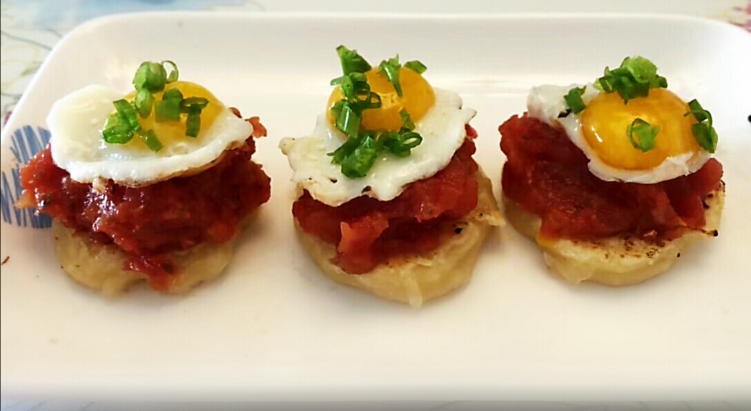 - In a pan, carefully fry the quail eggs. The hardest part is cracking the eggs. Place one on top of each pancake