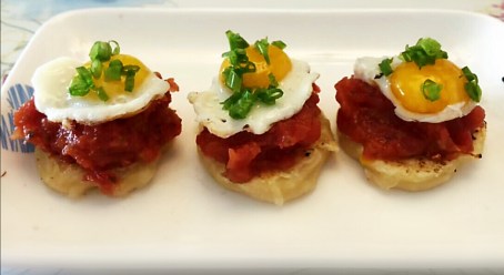 - Spoon about a tablespoon of tomato relish on top of each pancake. Be sure to smooth the top