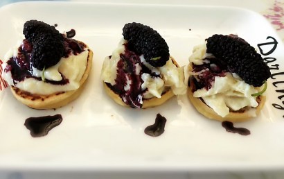 I really wanted to do a sweet spin on the pancakes. Looking in the fridge, I found some absolutely amazing mulberries and durian just begging to be used. Hence, Violet Love- pancakes topped with home made durian frozen yogurt and mulberry syrup.