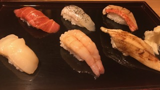 (Back row: Medium Toro, Grilled Hamachi, Grilled red snapper. Front Row: scallop, sweet shrimp, grilled eel)