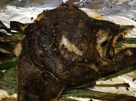 - Put the fish head on top of the garlic sprouts and bake for about 15 minutes. The fat should be rendering and the skin slightly brown