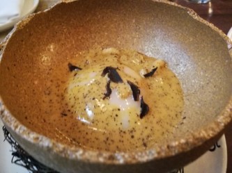 62 Degree egg and Truffle soup- To start, this dish isn’t much of a soup. It’s basically a sous vide egg smothered in warm truffle infused cream. With that said however, I thought the dish was very creative, not to mention beautiful. There’s a “do it yourself” aspect and the egg yolk actually emulsifies nicely with the cream to make a wonderfully fragrant dipping sauce for the complementary bread. The intense truffle flavour is enhanced with a touch of citrus zest. With that said, I personally found even a spoonful too rich eat alone as a “soup”, especially when it got cold