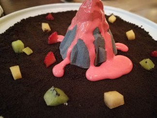 Chocolate Volcano Cake- My mom and brother were hankering for some dessert, so I ordered this thinking it was a mistranslation of a chocolate lava cake. Turns out, their volcano was a literal volcano made of chocolate cake with an ice cream center. It sat on a “field” of bitter cake crumb “dirt” and the wait staff poured a strawberry cream “lava over the top. I found the dish extremely well composed. The cake itself wasn’t too sweet and held its own to the ice cream. The “lava” provided a nice fruity flavour and the bitter grainess of the dirt balanced out the sweet softness of the other elements.