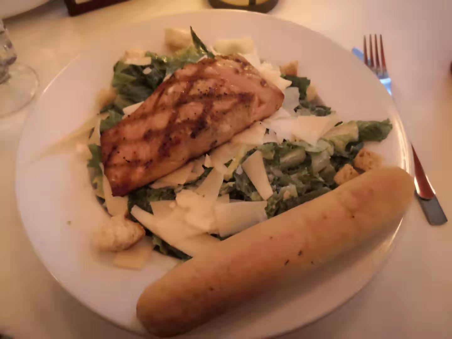 Salmon on Ceasar Salad- My friend also ordered salmon, on a salad. As with my salmon, it was seasoned and cooked to perfection (although my char was better 😉 ) The salad was nothing special, but well, not over, dressed.