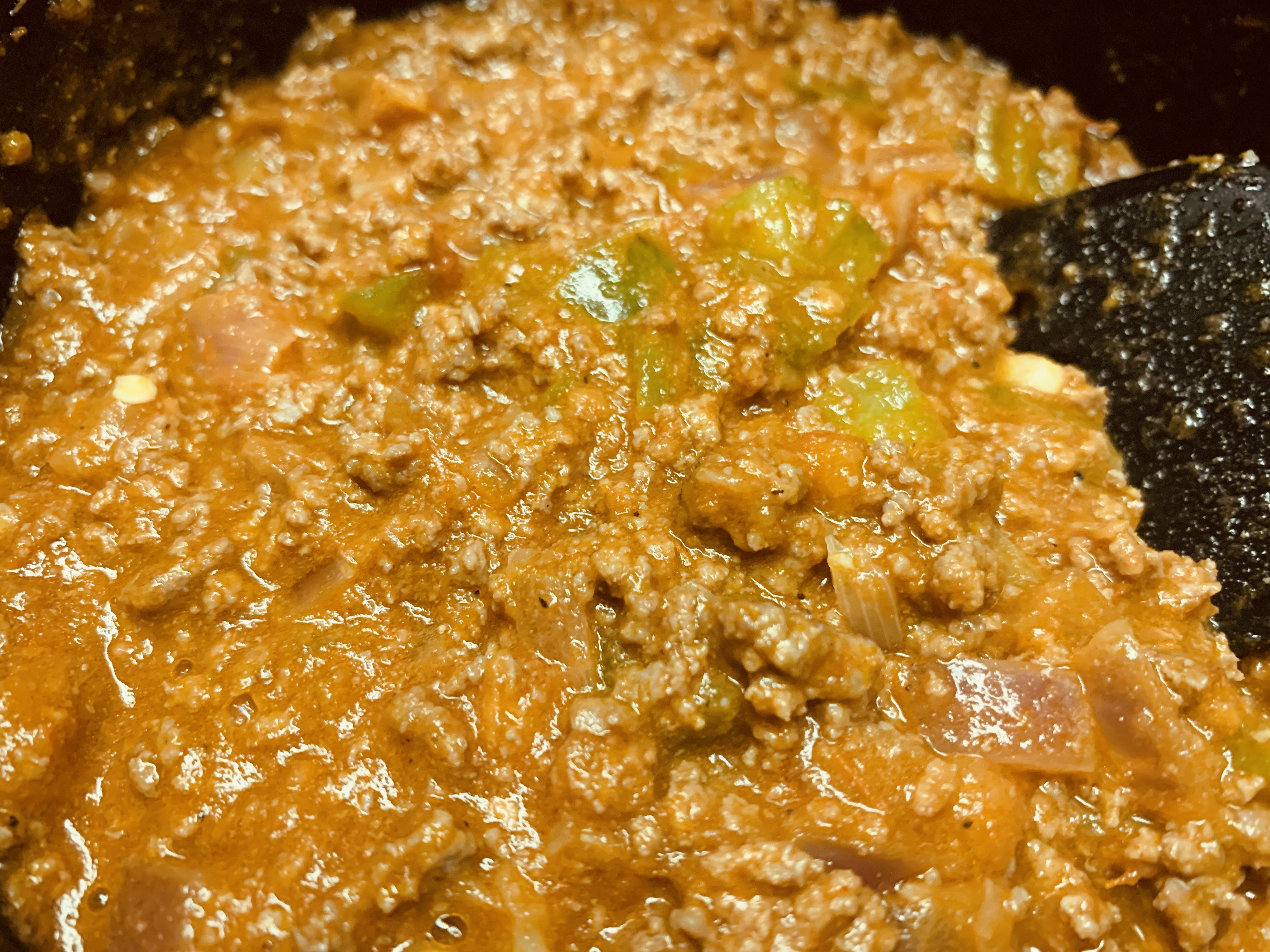 - Stir in ground beef and cook until browned. Add in tomato sauce, chicken stock and diced tomatoes. Bring to a boil. Add more salt if necessary.