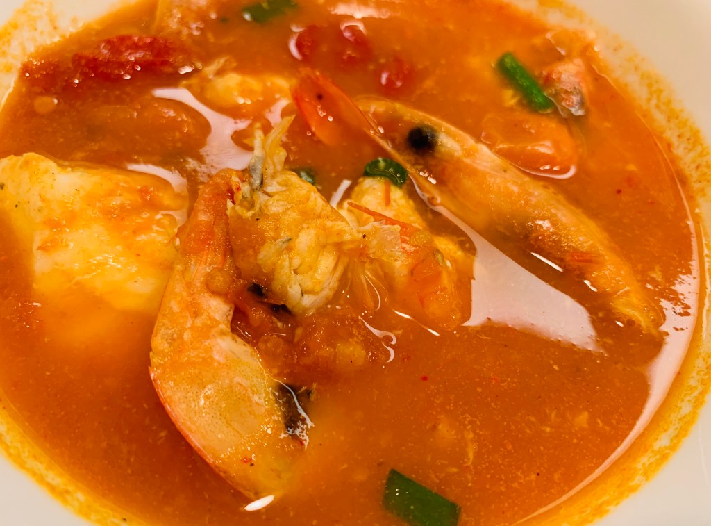 The acidity of the tomatoes brightens the umami of the shrimp, highlighting the natural sweetness. Using garlic and onion as the base creates rich undertones that marry the flavours together. Meanwhile, the mild cod soaked up the flavours. The firm flesh added real substance, turning a “soup” into a “stew”.