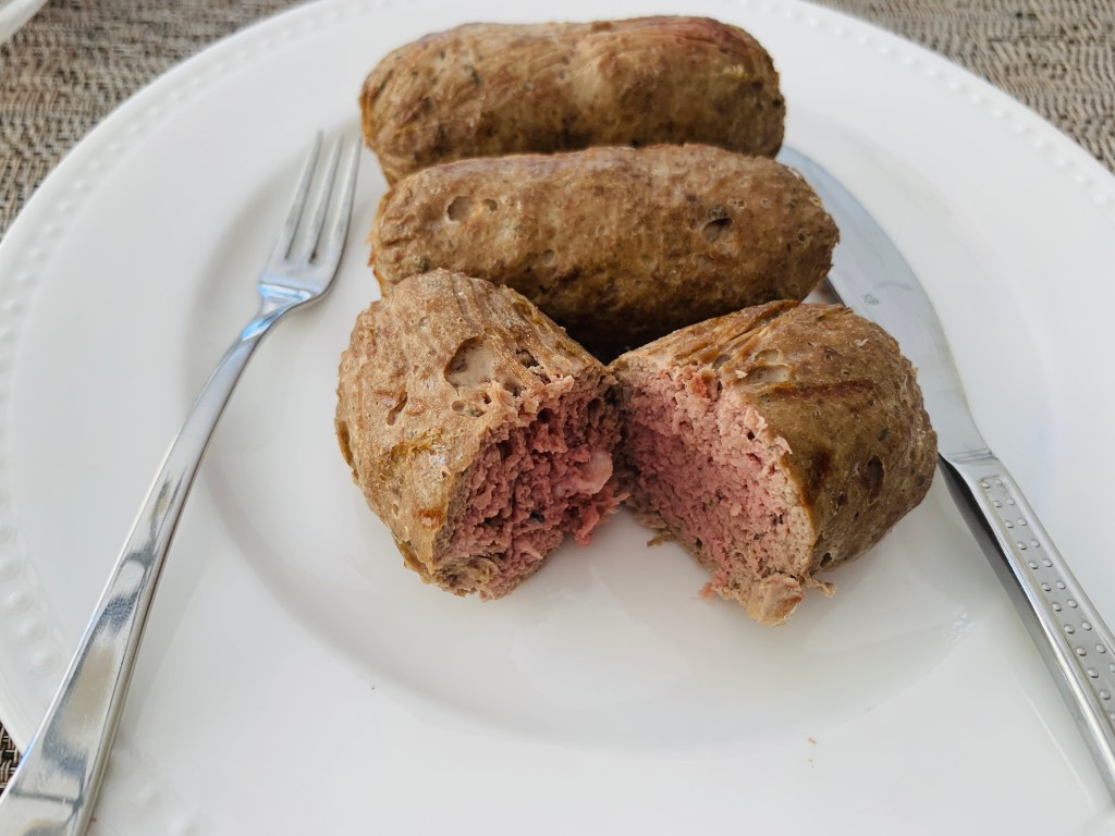 - Cut four 7.5in (long) x 12in (wide) sheets of plastic wrap. Divide meat mixture into 4. Spoon onto plastic wrap and roll like a roulade. Here’s a good reference: https://www.youtube.com/watch?v=aClRzPaYvEU