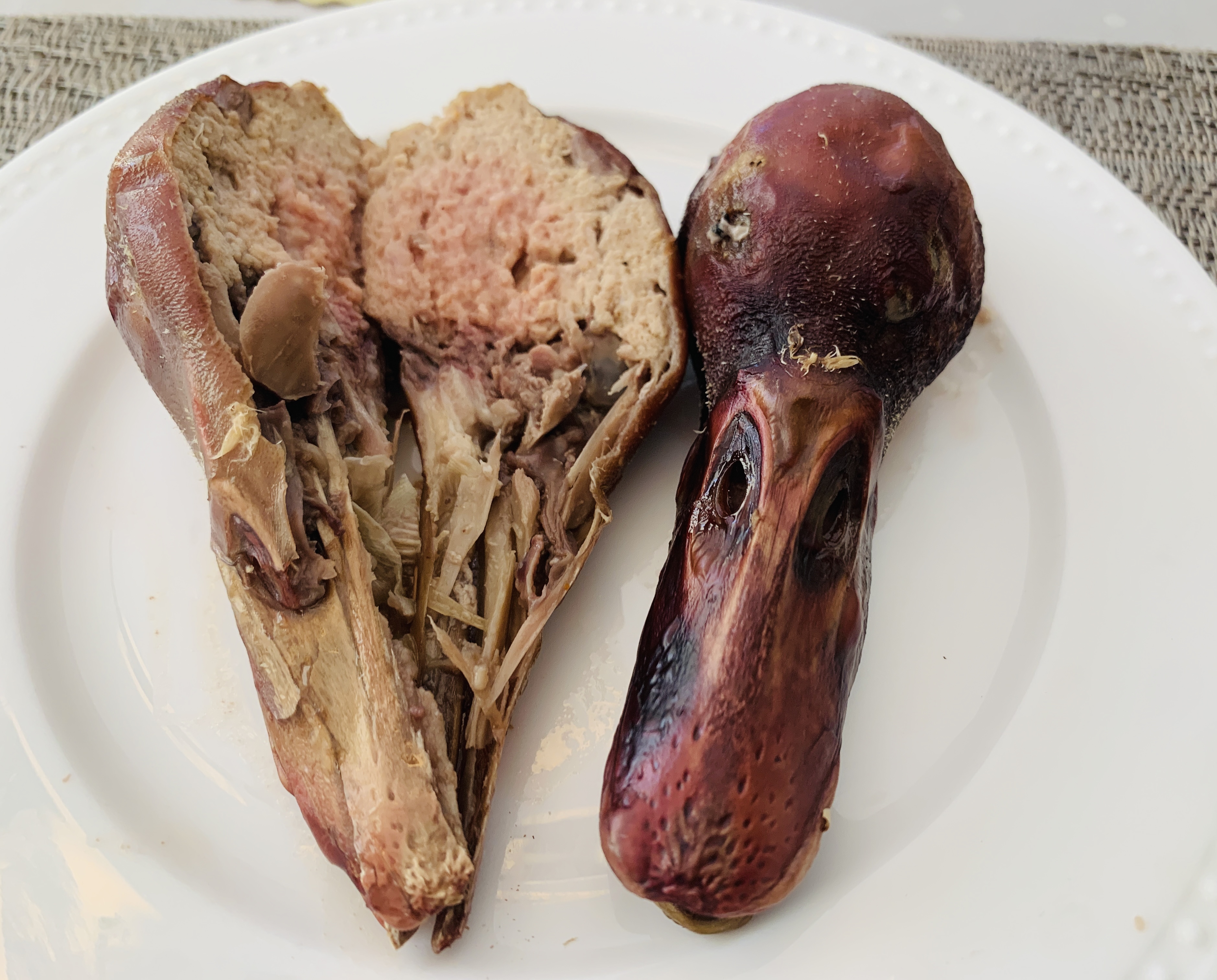 First the hard part: Debone the duck head.