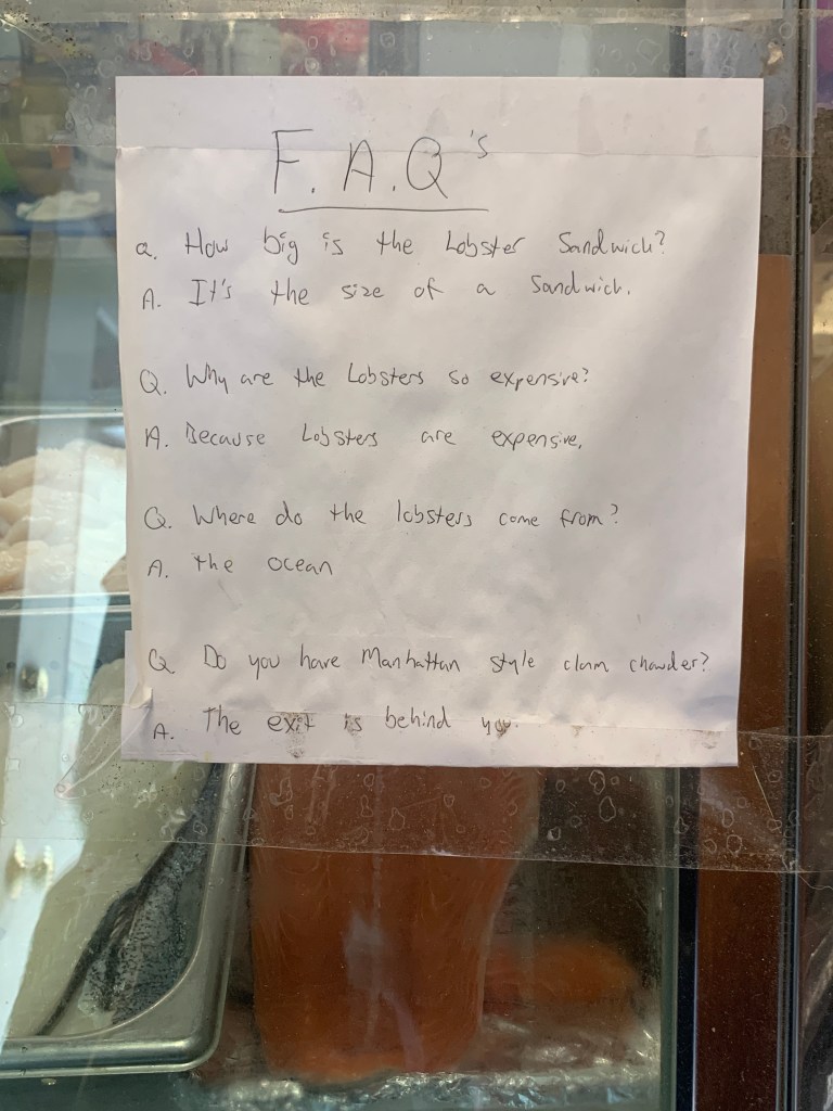 Alive and Kicking Lobsters is a small market/restaurant tucked in a residential neighbourhood on Putnam Avenue. Since opening in the late 1980’s it’s been a favourite of locals and tourists alike. I arrived RIGHT at opening time, but within 10 minutes, 20 more people had lined up at the door. I couldn’t wait