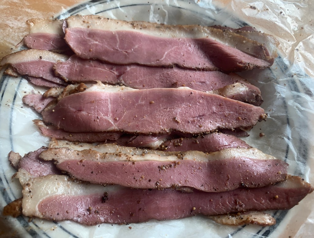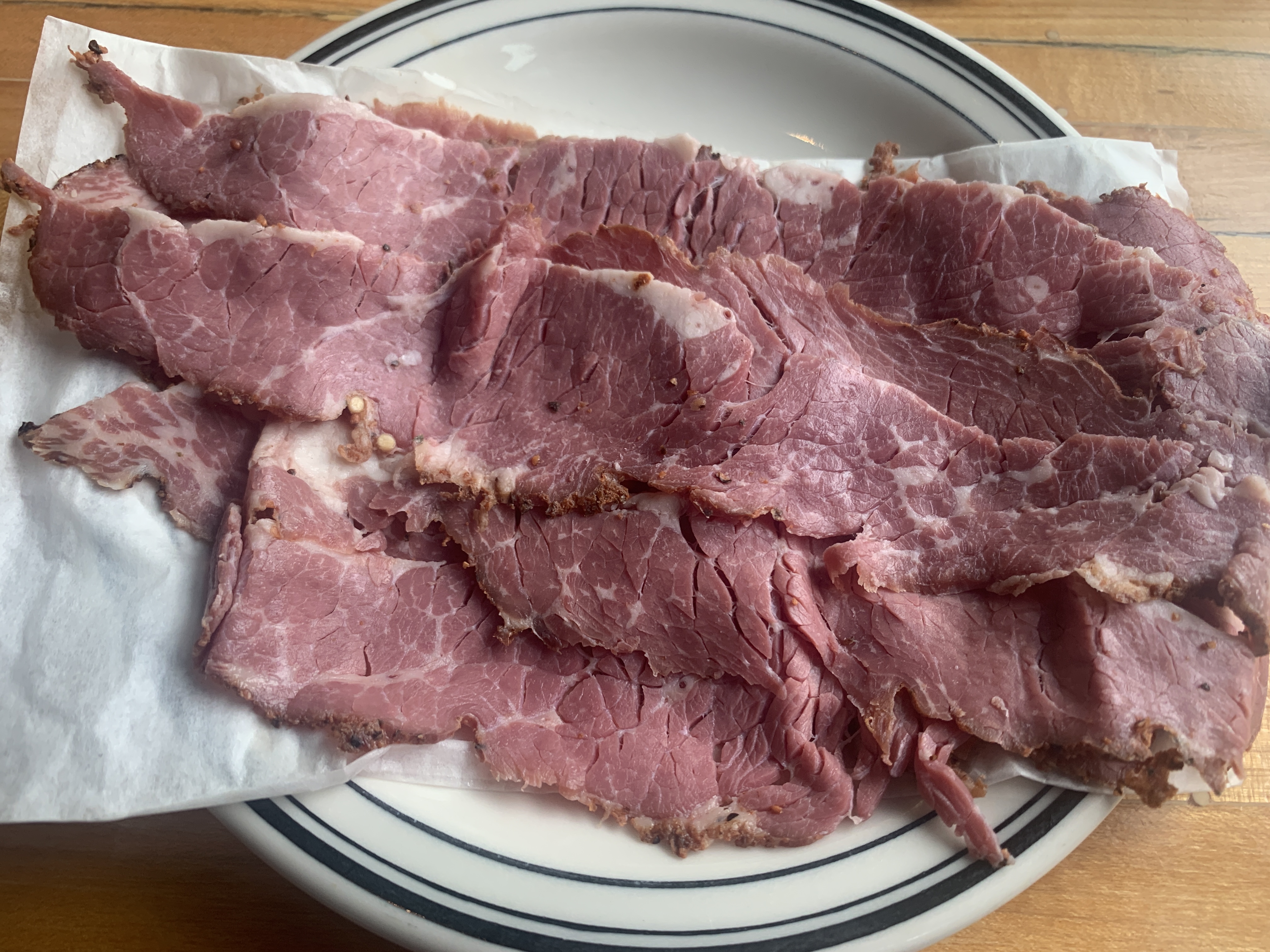 Duck Pastrami- I had the budget for one more item (thanks inflation). Being the curious eater, I ventured to try something different: duck pastrami. I should have stuck with the lox. the duck pastrami was over smoked and over seasoned almost to the point of being inedible. The meat was also quite dry