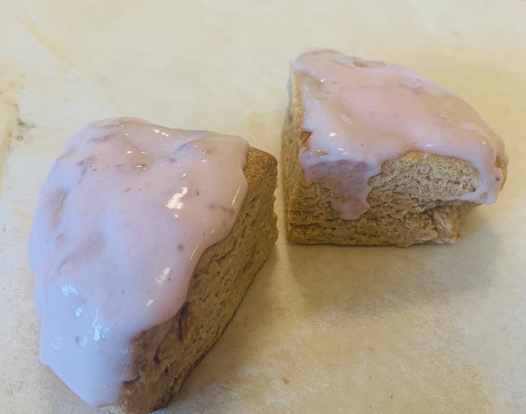- Once scones are COMPLETELY COOLED, Spoon glaze onto the top and spread evenly.