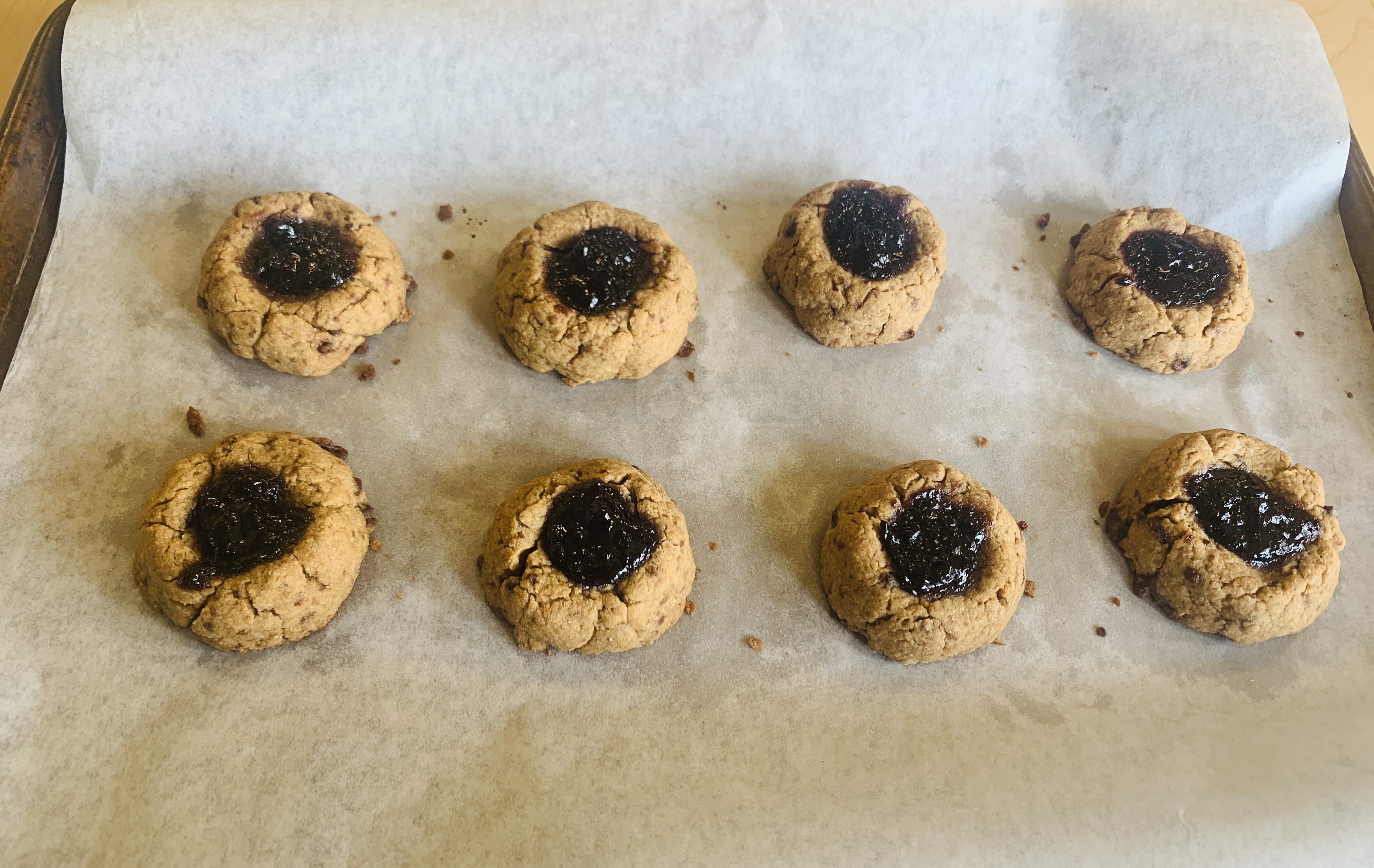 - Spoon 1tsp of jam into the divet. Bake for 13-14 min or util slightly browned