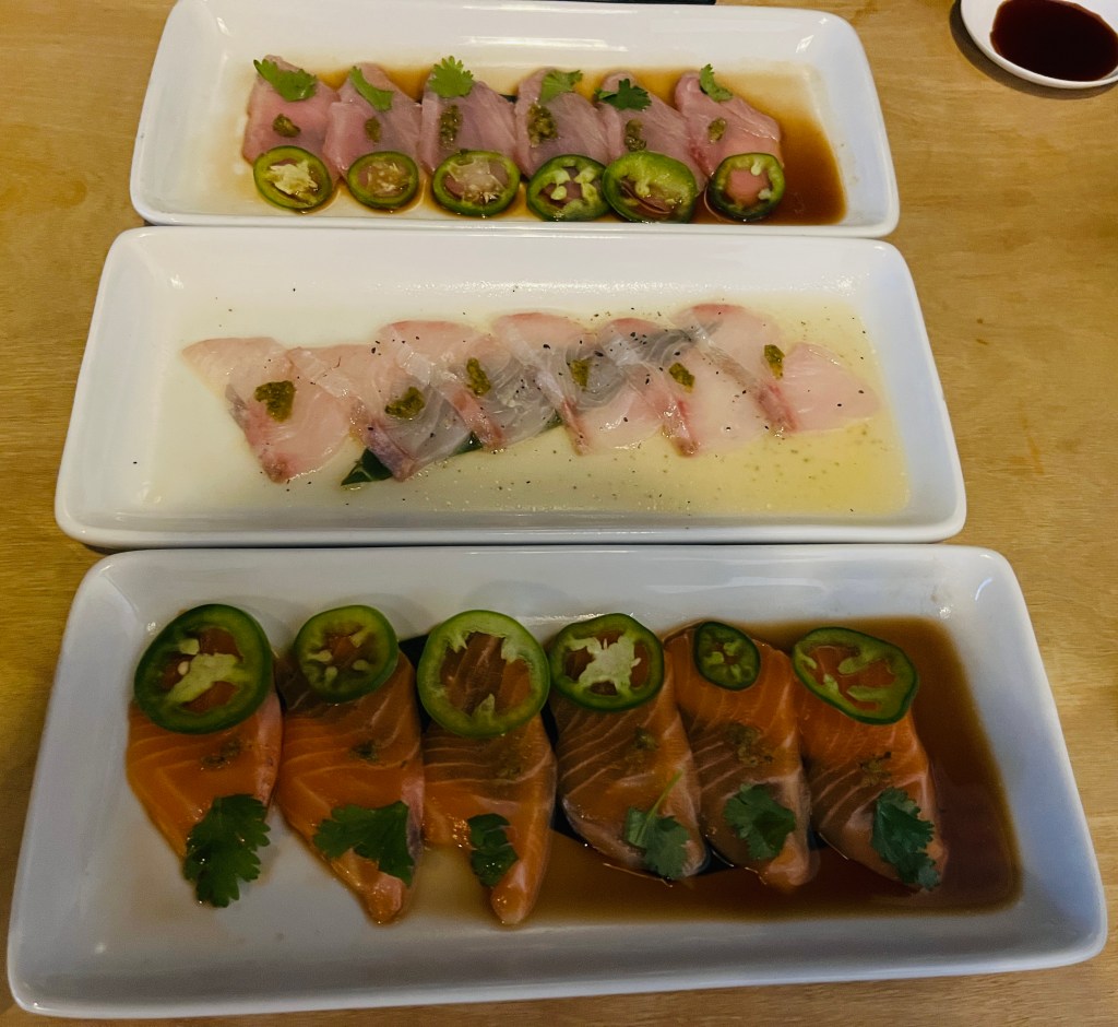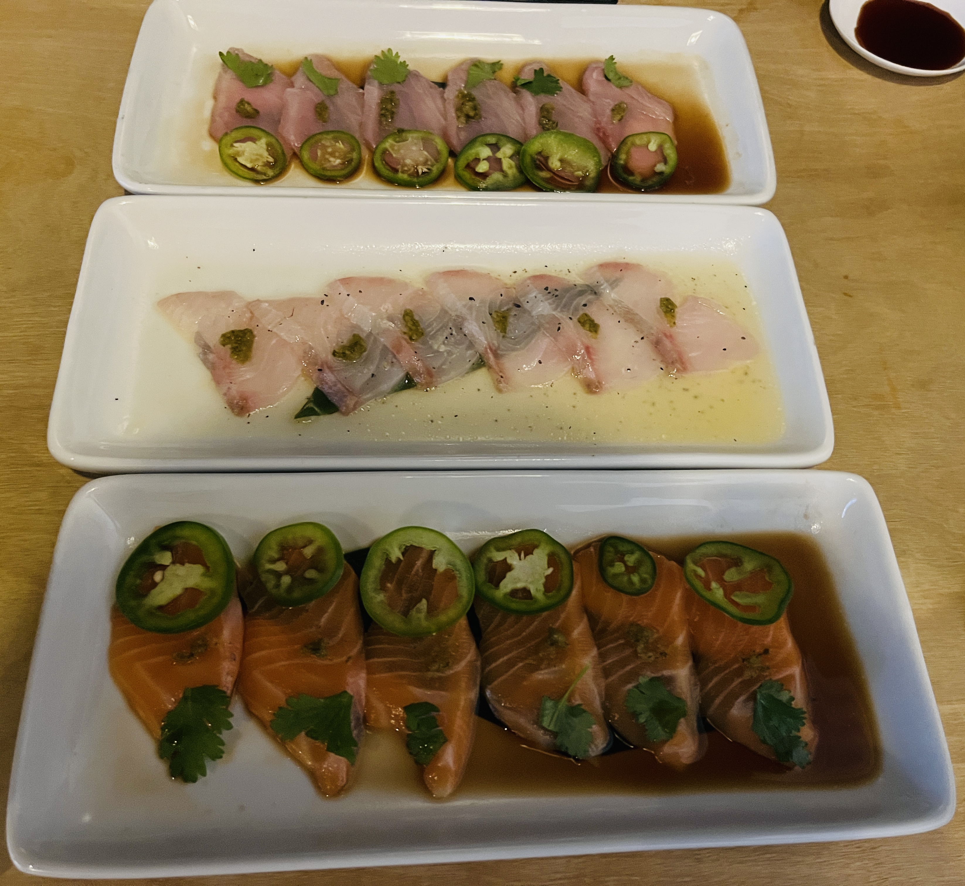Next came some “‘small'” plates: Kanpachi Yuzu, Hamachi Jalapeño, Sake Jalapeño. I say “small” because unlike Mola, each portion is a generous 6 pieces.