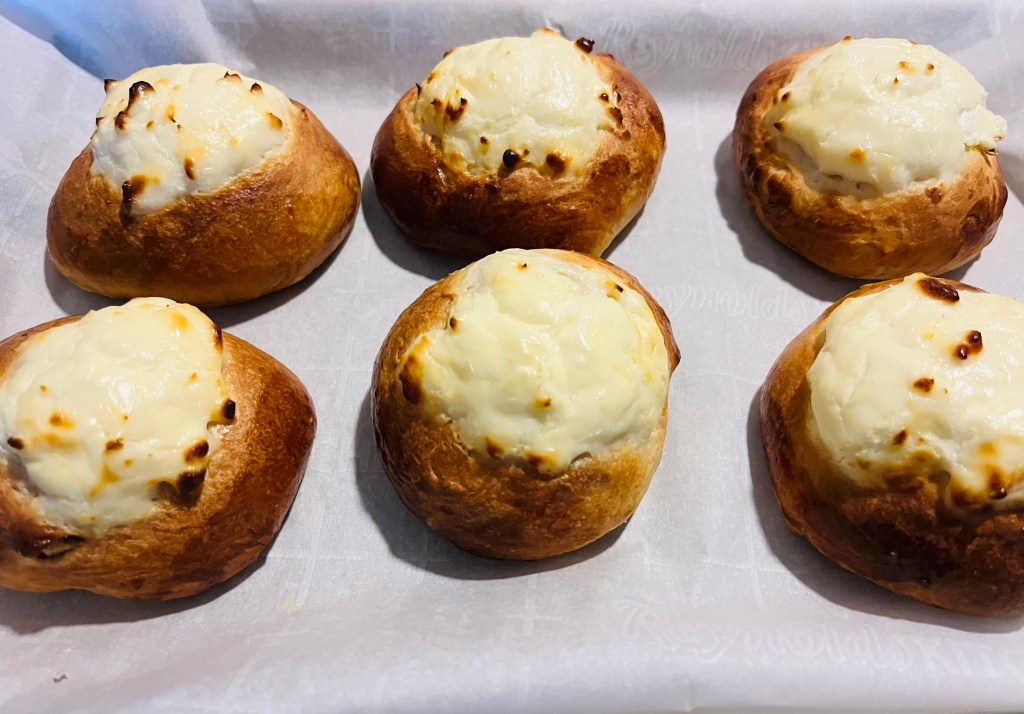 - Flatten the dough balls into thick disks and make a divet in the centres. Spoon a heaping tablespoon of cream cheese filling into the divets