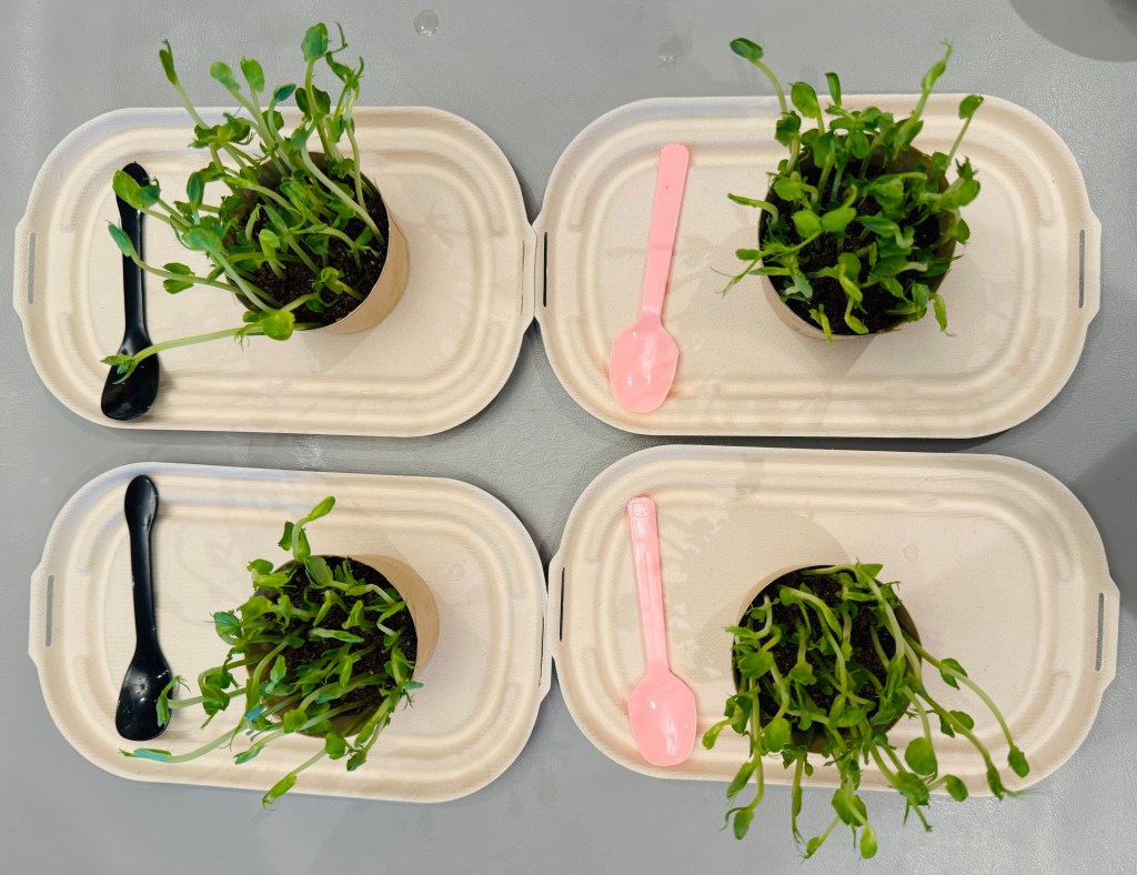 The real trick with this dish is the presentation. The idea is to make it look like homegrown sprouts. For the dinner, I used coffee cups cut in half. Tupperware, takeaway containers or even mini jars are other good options. Personally, I needed a workaround for the lack of suitable tableware and this fit the bill.
