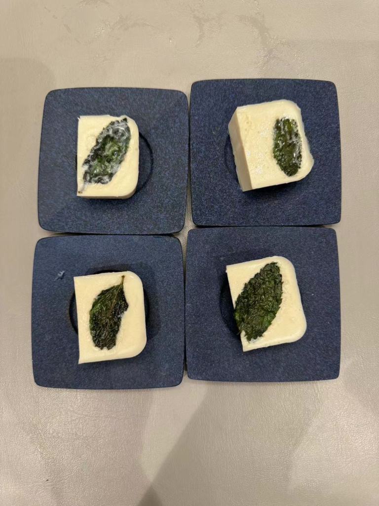 - Carefully put the pea shoots stem side down into the puree. Don’t worry about uniformity it will look more natural that way